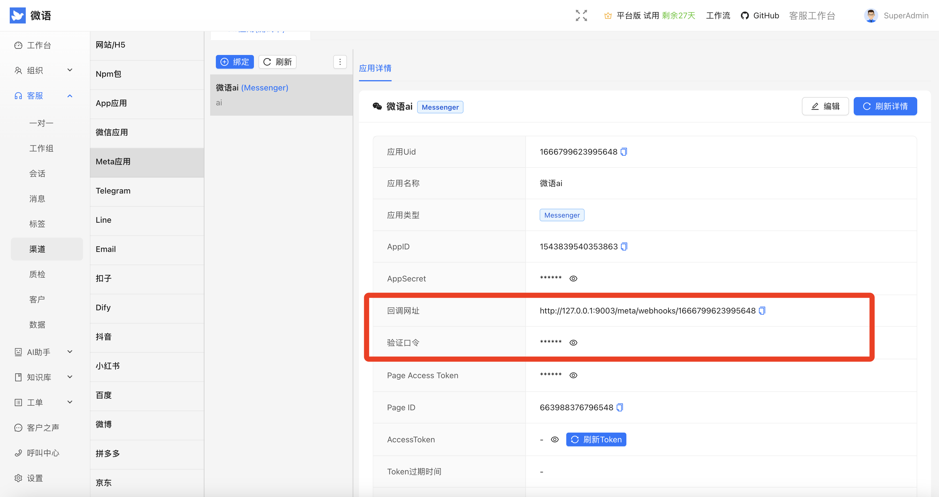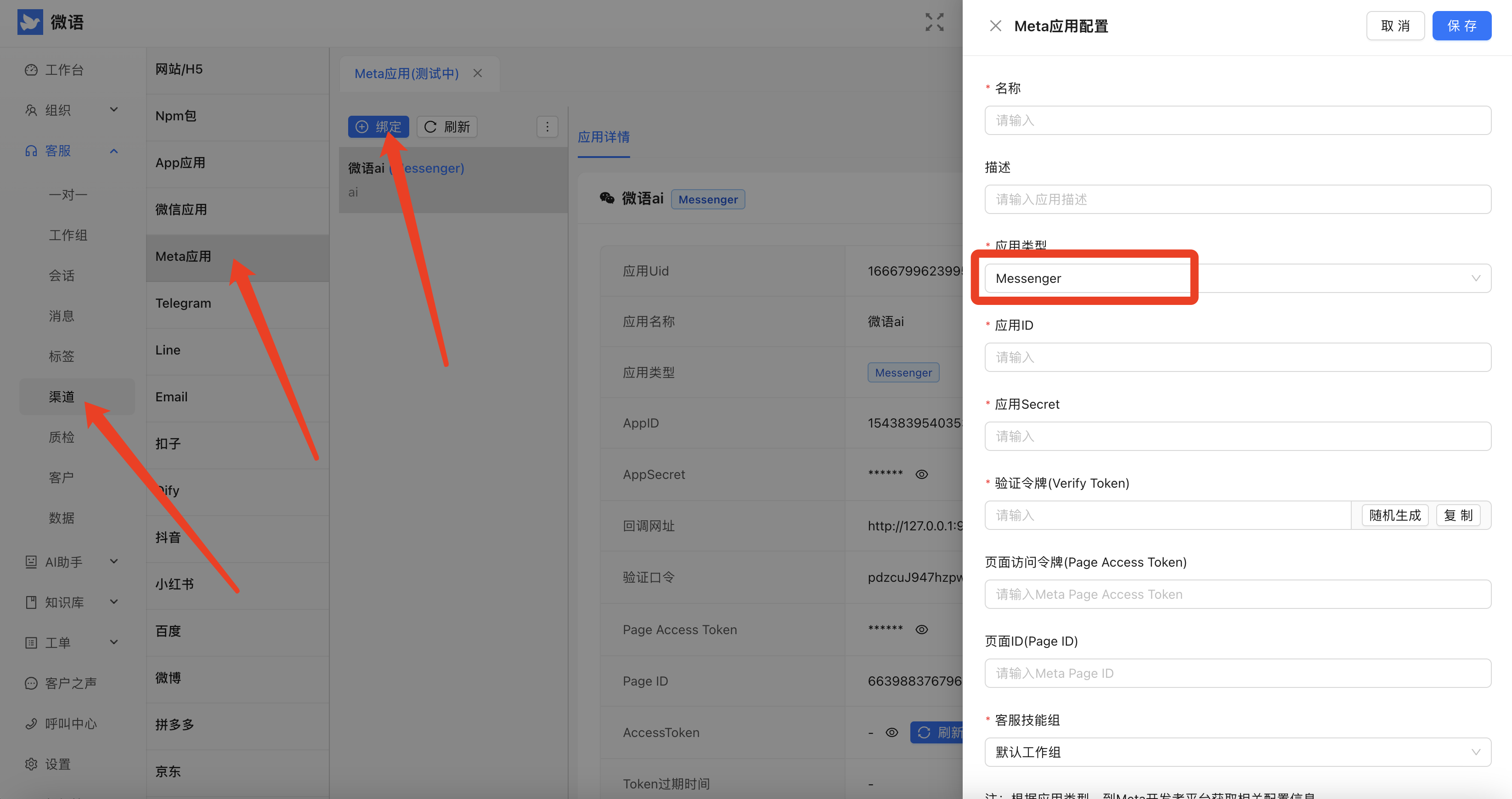 渠道对接Facebook本页总览Facebook Messenger 前置条件 社区版不支持,请升级到企业版或平台版。请替换licenseKey 服务器需要能够访问Facebook的API接口网站 graph.facebook.com,请使用海外服务器或代理,否则无法正常使用。 功能简介